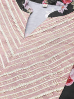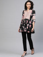 Taking the bright colors of summer and nature, Ahalyaa inspires the Women of style and substance to experiment with a range of colors from sophisticated black to subtle pastels and vibrant shades. So match the shade to your personality! Mix and match from a variety of colors and prints for a feminine look, or a modern twist. A Black and Pink floral print Tunic with gotta Patti detailing, has a mandarin collar, three-quarter sleeves, and Embellished detail