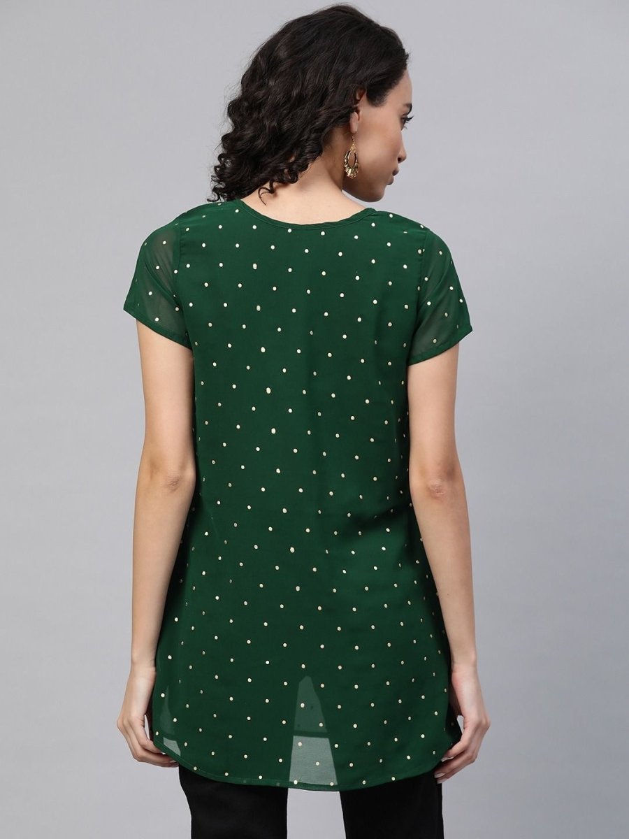 Taking the bright colors of summer and nature, Ahalyaa inspires the Women of style and substance to experiment with a range of colors from sophisticated black to subtle pastels and vibrant shades. So match the shade to your personality! Mix and match from a variety of colors and prints for a feminine look, or a modern twist. This is a Green and Golden Layered Polka Dots Print Tunic, has a round neck, short sleeves, and Layered detail