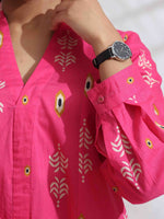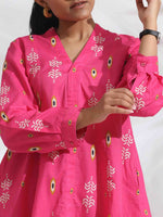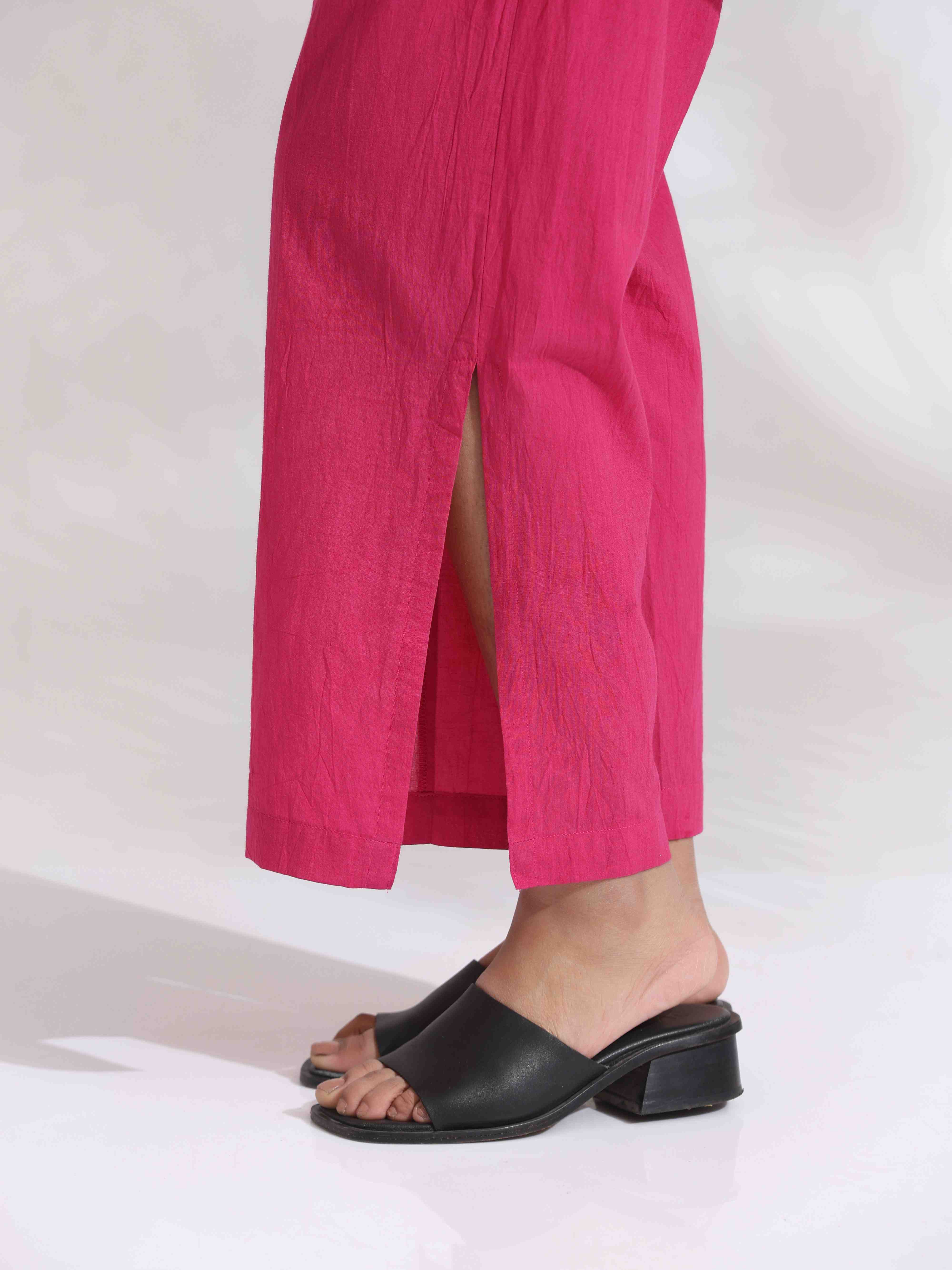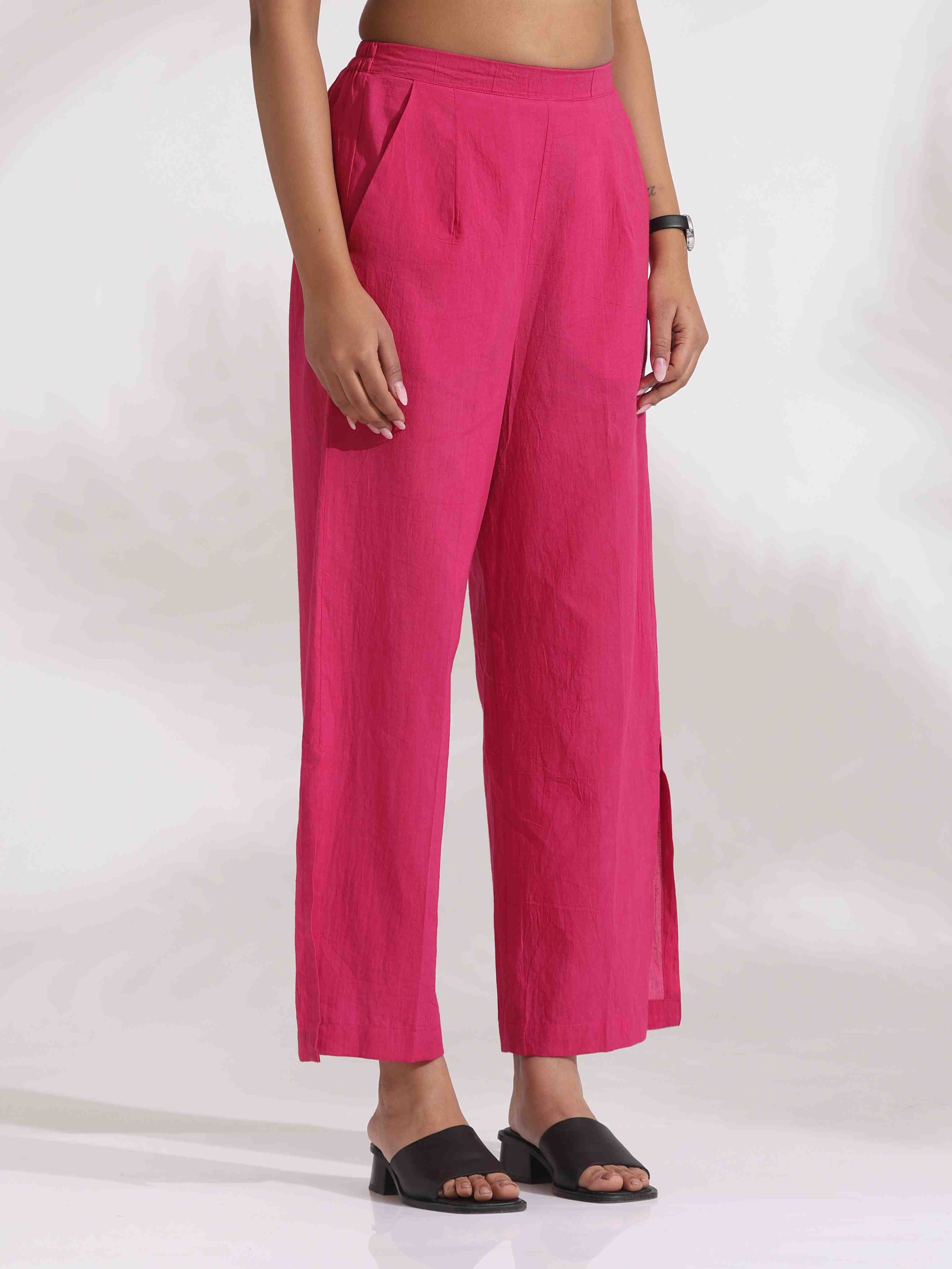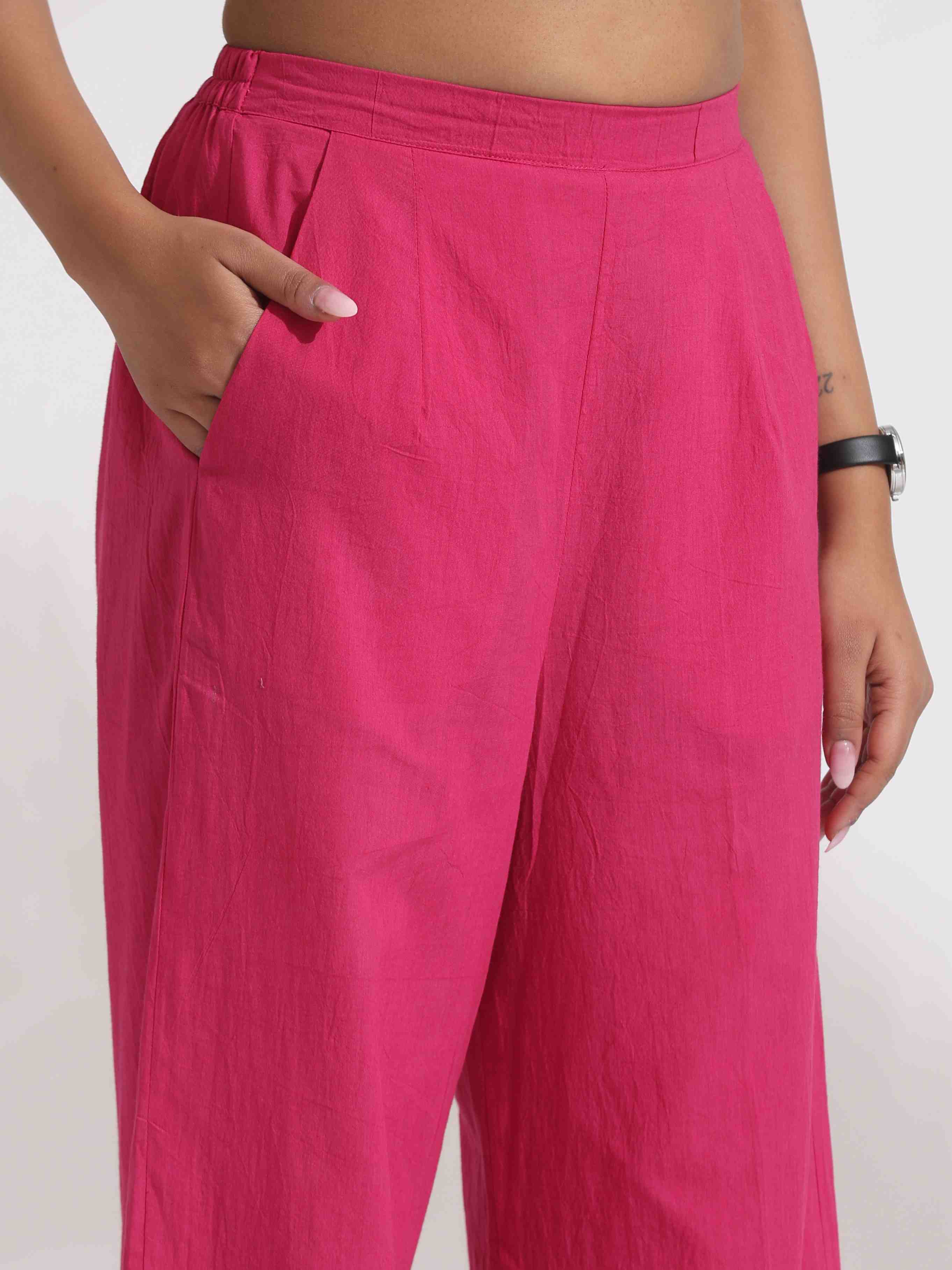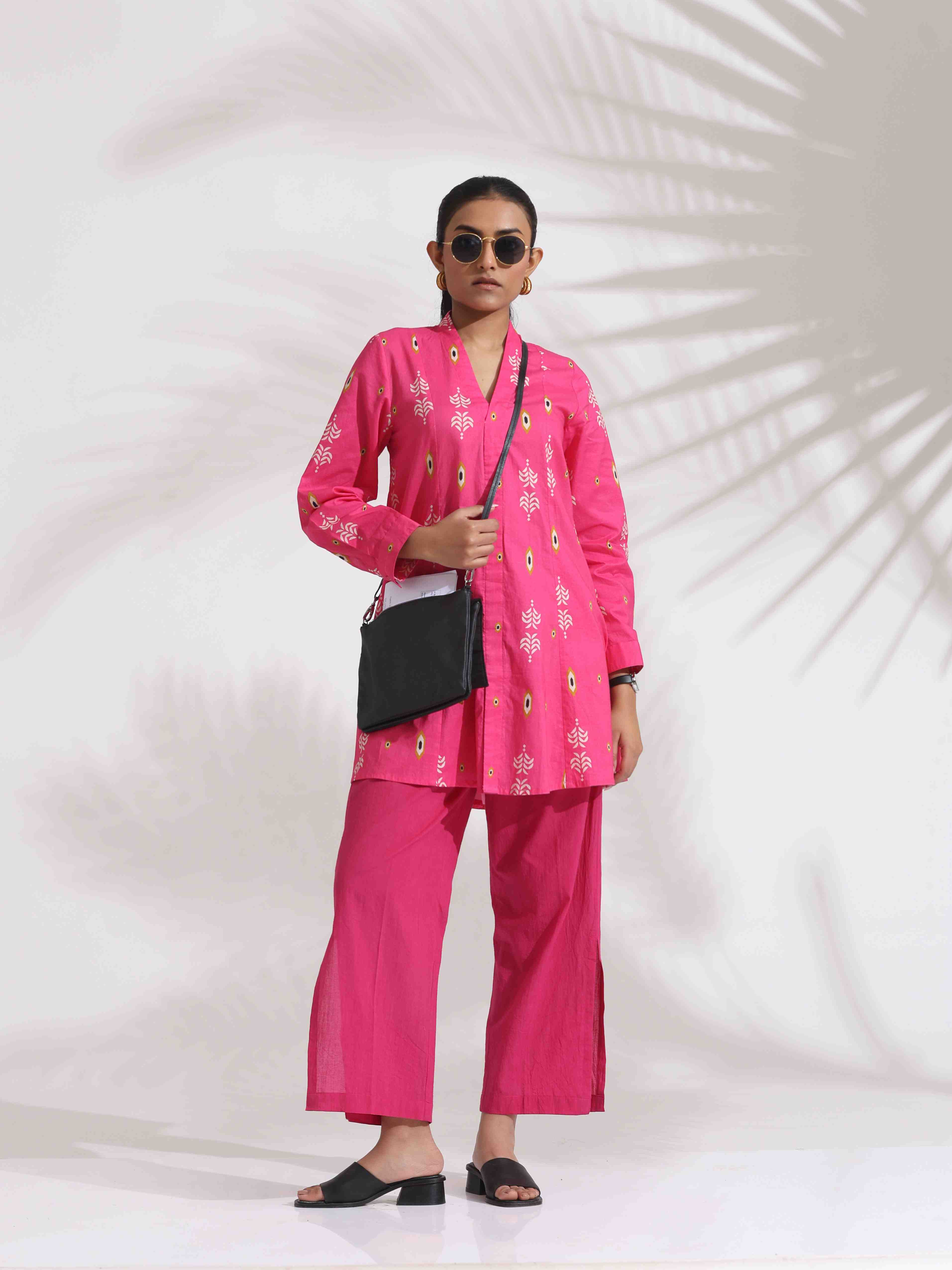 • Elevate your style with this pink cotton printed flared top, featuring paneling at the front and back. Paired perfectly with pants which has slit for design detail, it offers an ideal blend of elegance and comfort for a chic, effortless look.