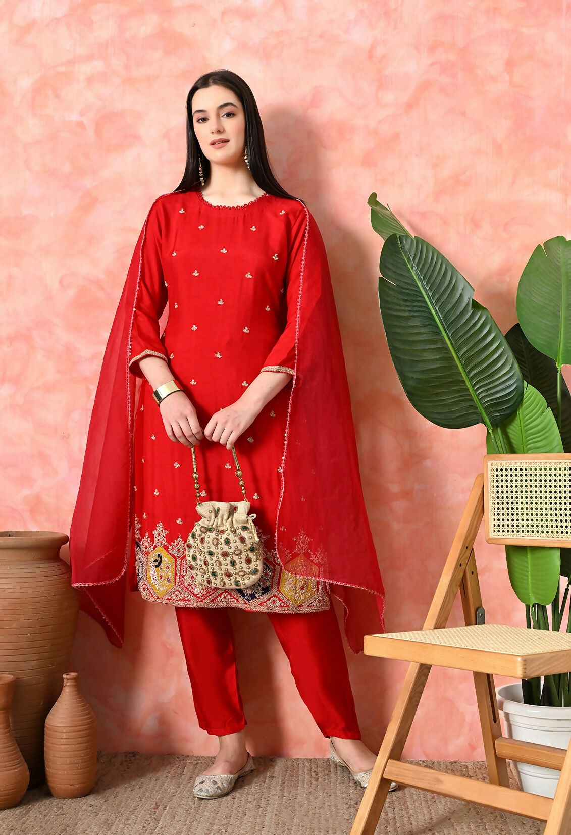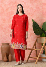 Joban Fashion Red Premium Pure Viscose Print Dola With Handwork Kurta Set Fabric : Premium Pure Viscose Dola With Handwork Pant : Pure Viscose Do...