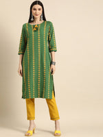 All About You Women Green Ethnic Motifs Printed Kurta with Mustard Yellow Trousers - XS