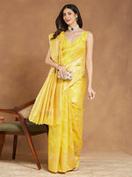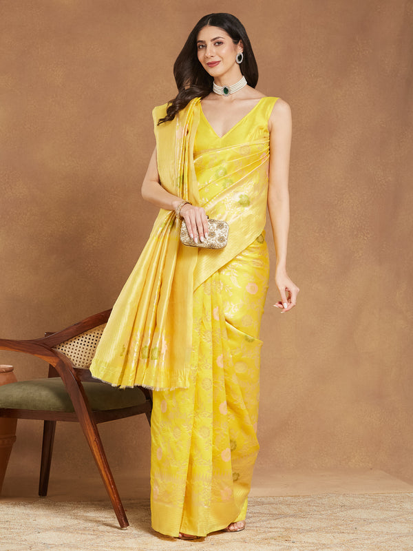 Janasya Yellow Silk Blend Floral Jacquard Saree