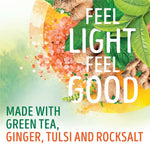 Green Tea is a natural source of catechins, & doubles up as a refreshing, hydrating beverage, and is virtually of zero calories, when had without milk & sugar, making every cuppa a magical experience! It is also a great way to meet your daily required fluid. Ginger helps reduce bloating and helps relieve stomach discomfort. Tulsi supports smooth digestion. Rock salt helps soothe stomach. These ingredients work together and help bring about digestive benefit helping you feel light after meals.