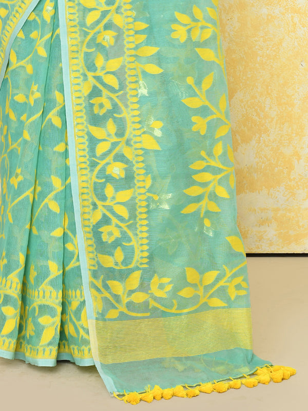 Piyari Fashion Women's Light Turquoise Cotton Silk Jamdani Saree