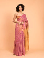 This saree is by Suta Pvt. Ltd. It is made from Linen zari and finished in Pink Colour. The saree comes with an unstitched blouse piece