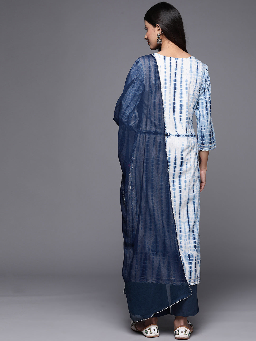 Varanga Women Straight Kurta With Round Neck Paired With Blue Solid Palazzo And Blue Solid DupattaWhite And Blue Shibori Printed Kurta With Gota Em...