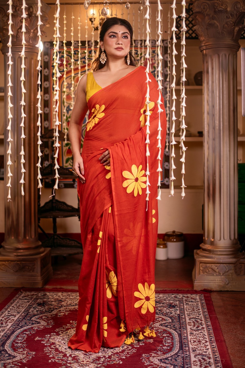 Very Much Indian Mastaani - Pure Mul Cotton Handloom Saree with Beautiful Floral Handpaint - Red - Distacart