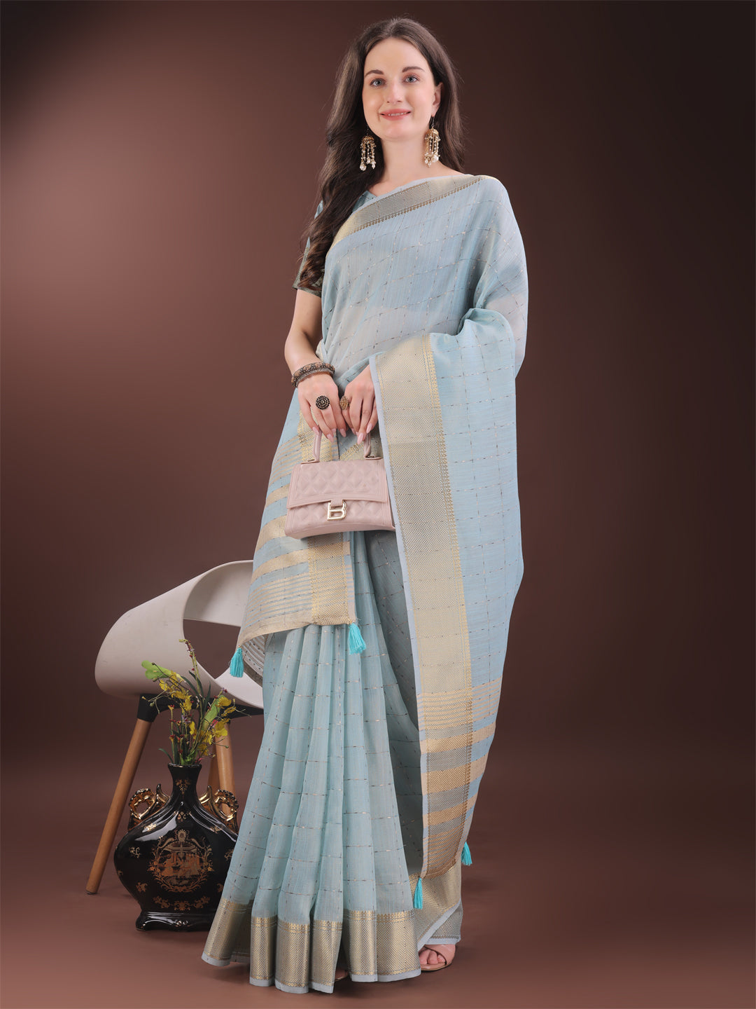 This Sky Blue organza saree is a blend of modern sophistication and traditional charm. Crafted from feather-light organza fabric, it features a golden zari border and delicate tassels on the pallu. Perfect for festive occasions, weddings, or elegant parties, this saree offers a luxurious look while being breathable and easy to wear. A matching unstitched blouse piece is included to complete your ensemble.