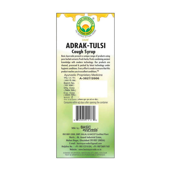 Basic Ayurveda Adrak Tulsi Cough Syrup Adrak (Zingiber officinale), has the power to reduce Kapha dosha. According to Ayurveda, excess of Kapha ene...