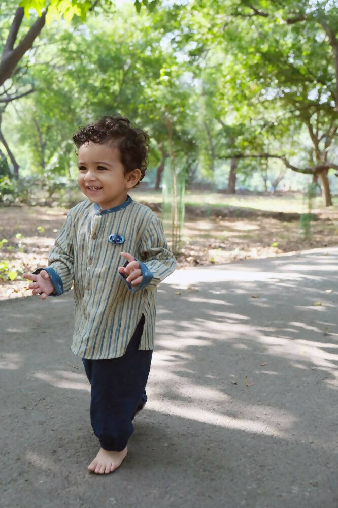 Mhyssa Manny Full Sleeve Beige T-shirt With Blue Pants Set For KidsAbout the Product: Indgo Dyed - Bellwether Blue Khadi Kurta Co-Ord set is a rela...