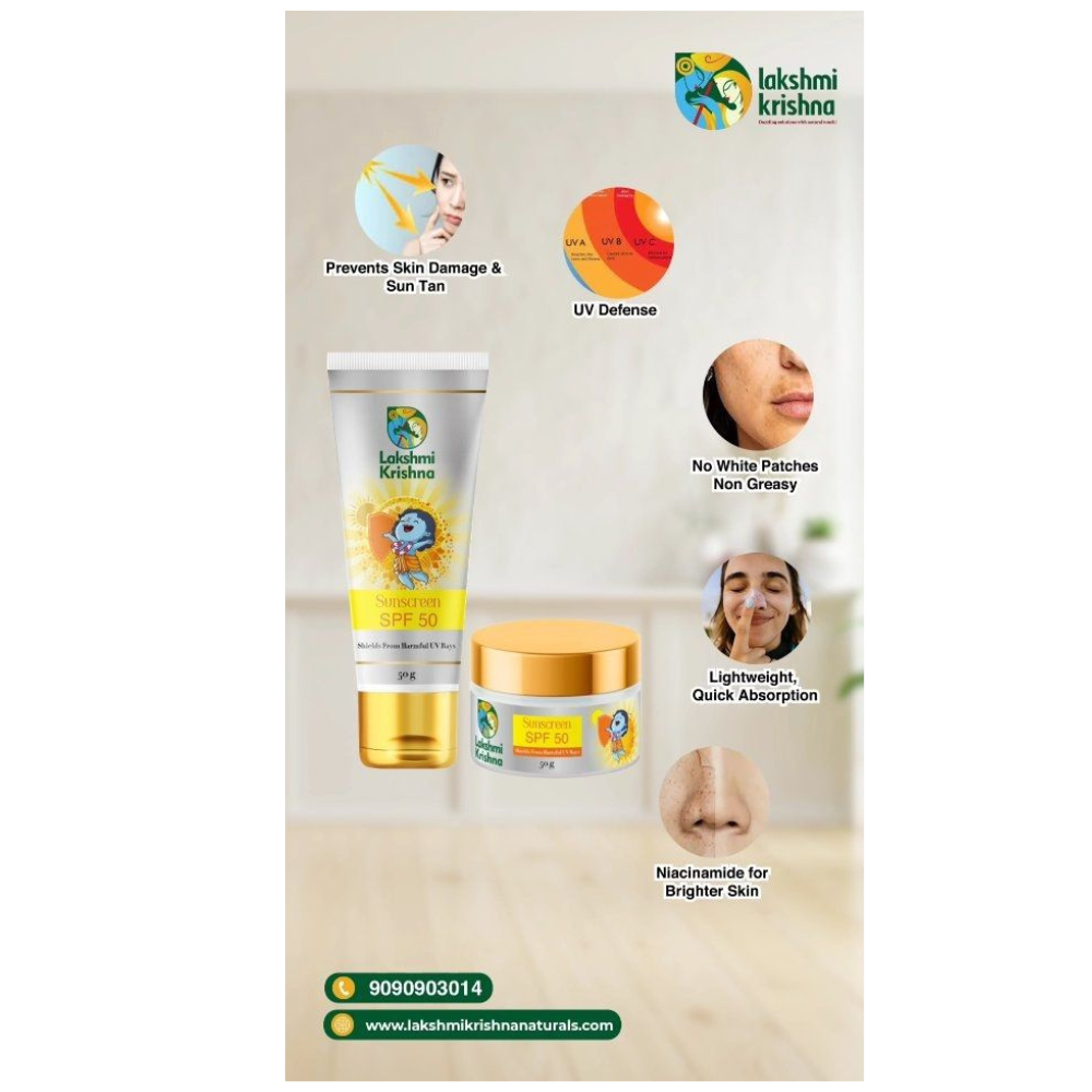Lakshmi Krishna Sunscreen SPF 50About the product:Sun Protection Factor (SPF) rating indicates how long you can stay in the sun wearing sunscreen w...