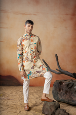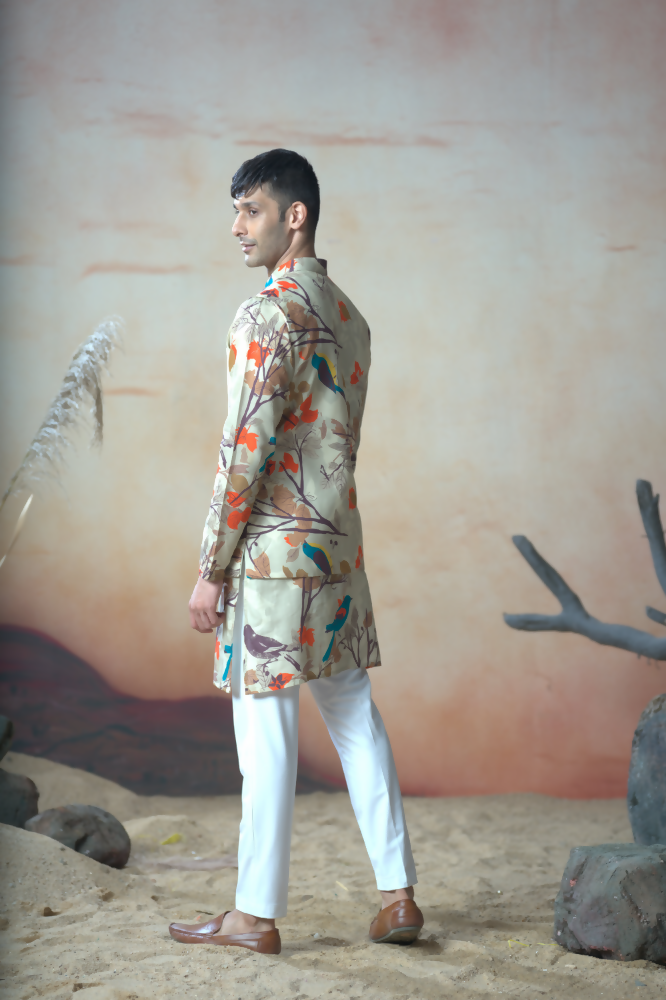 This Serenity bird-themed print Nehru jacket set is crafted from soft cotton fabric and features a tranquil design focused on bird-related motifs. The jacket and kurta showcase peaceful, nature-inspired aesthetics, with intricate prints of serene birds like doves and sparrows, creating a calming and harmonious look. The delicate bird motifs evoke a sense of tranquility and peace, making this ensemble a perfect choice for those who appreciate garments that embody a serene ambiance and natural charm.