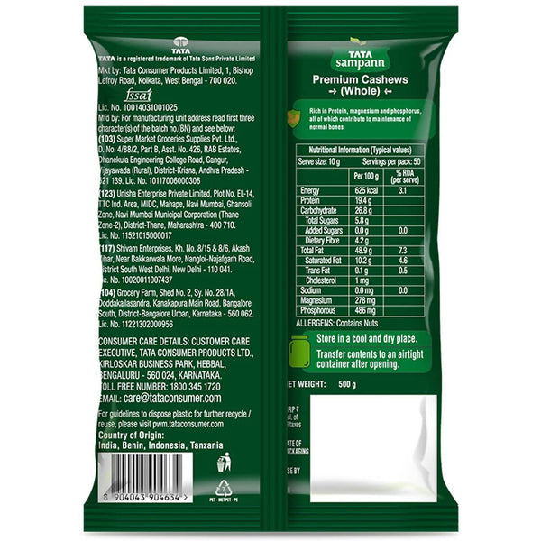 Tata Sampann Premium Cashews WholeIngredients:Cashews WholeLegal Disclaimer: Product images are for illustrative purposes only. Images/packaging/ l...