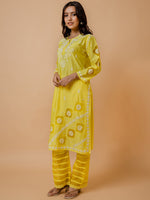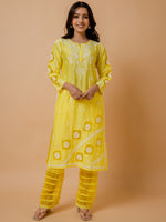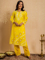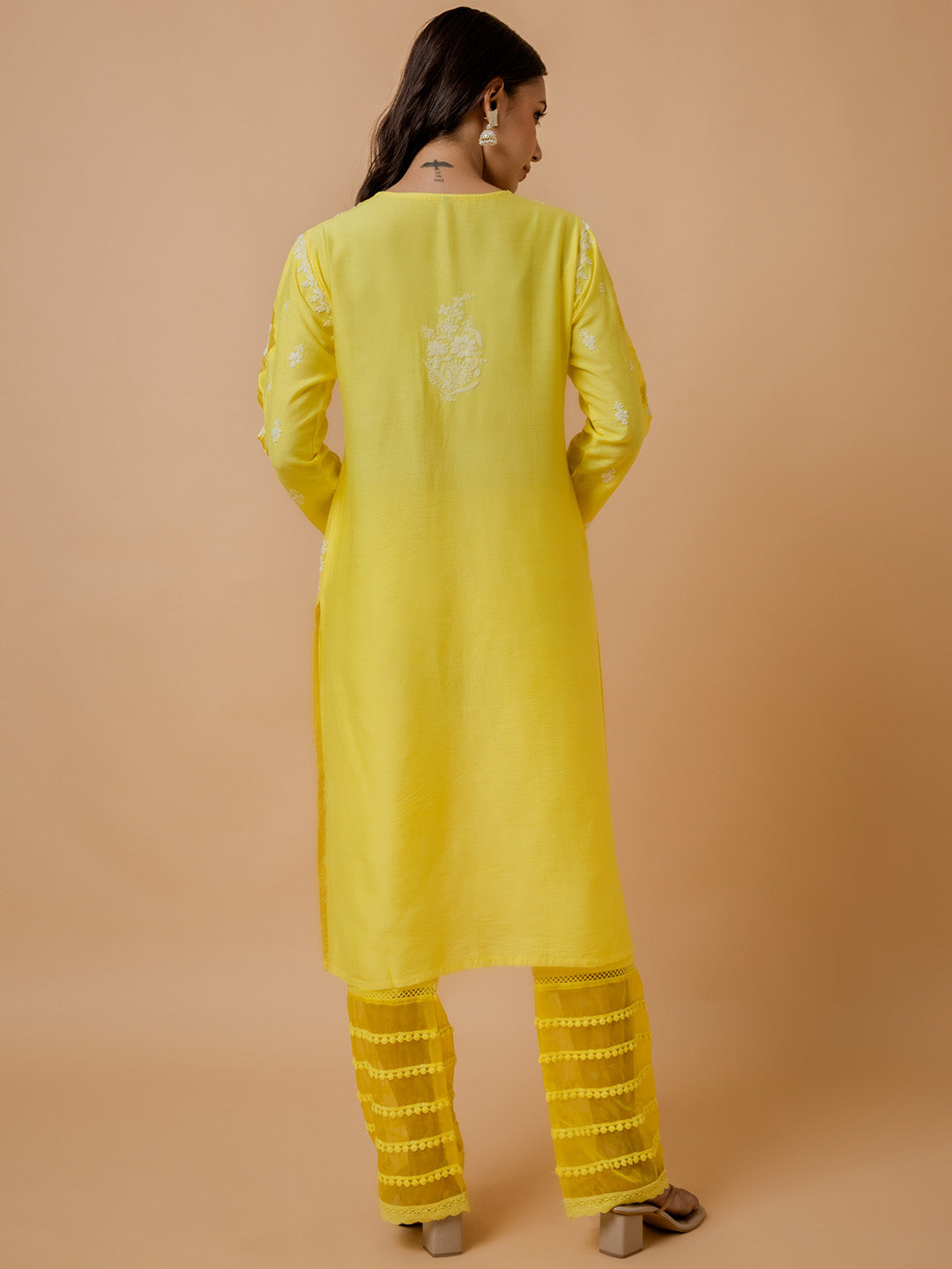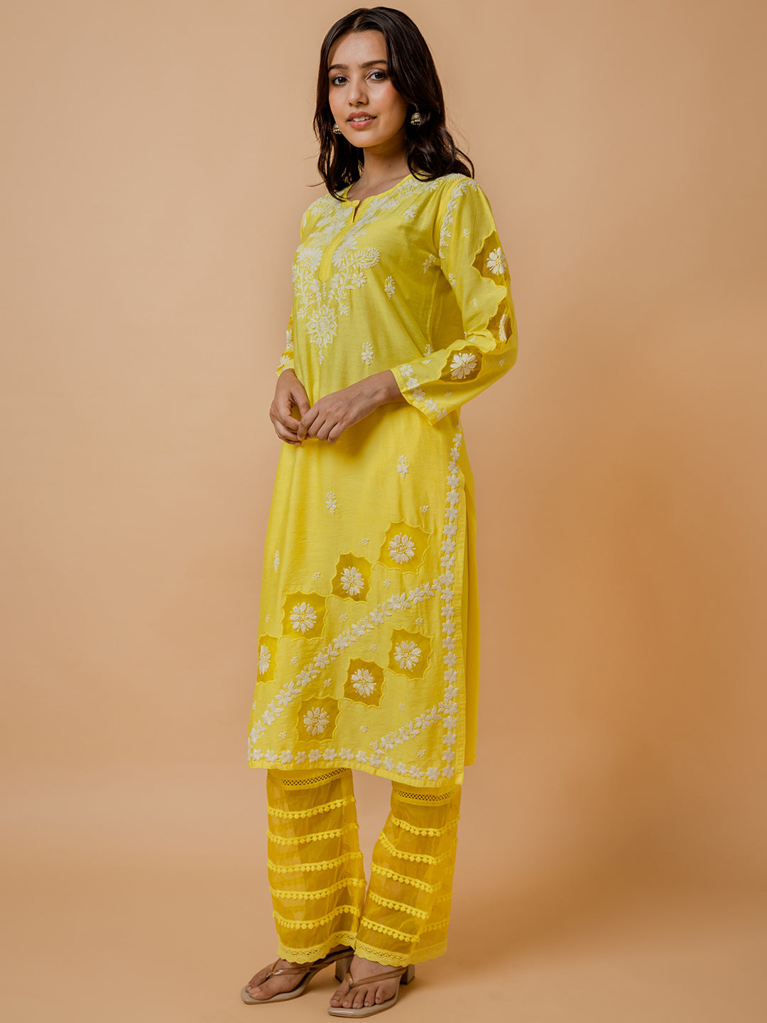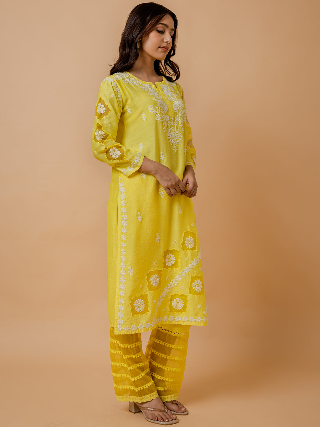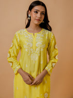 HOUSE OF KARI Ethnic Motifs Embroidered Round Neck Chikankari Chanderi Silk Kurta Product Details Colour: yellow & white Ethnic motifs embr...