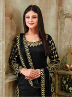 Black Art Silk Real Glass Work Suit features a art silk top with santoon top and santoon bottom. embroidery is completed with dori and stone work. This Style is made in India and checked by hand to ensure high quality.