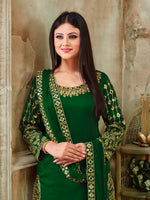 Green Art Silk Real Glass Work Suit features a art silk top with santoon top and santoon bottom. embroidery is completed with dori and stone work. This Style is made in India and checked by hand to ensure high quality.