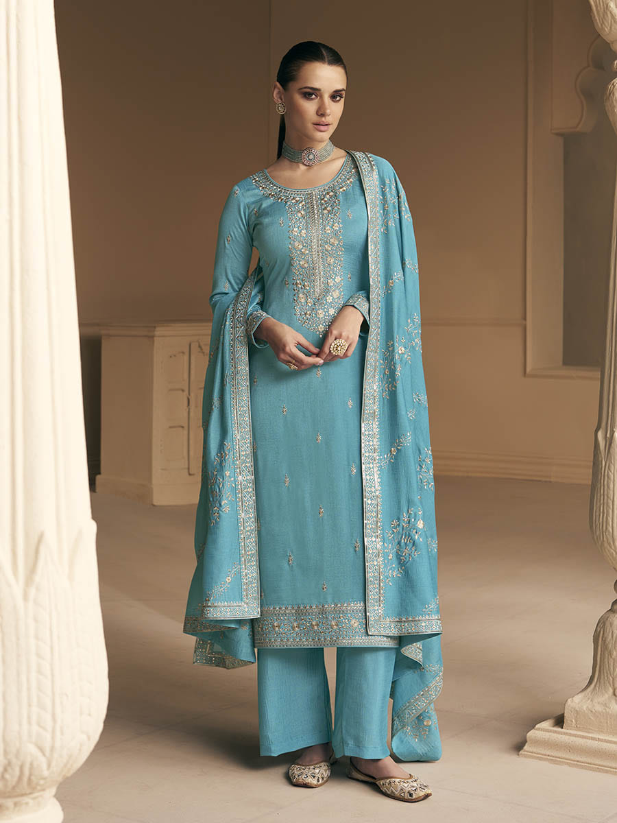 Myra Sky Blue Premium Silk Embroidered Pant Style Suit - Distacart