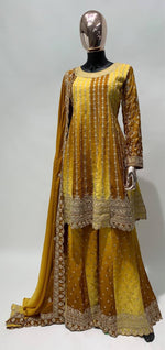 A full-stitched Chinon top (up to 42") with Santoon inner, fully-stitched Chinon bottom (42"), embroidered Chinon dupatta (2.15m), weighing 1.5 kg.