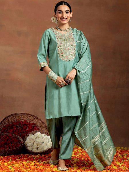 Vegaa Fashion Bottel Green Chanderi Silk Embroidered Salwar SuitProduct Details:Wedding suit is the perfect choice for Indian festive or wedding ev...