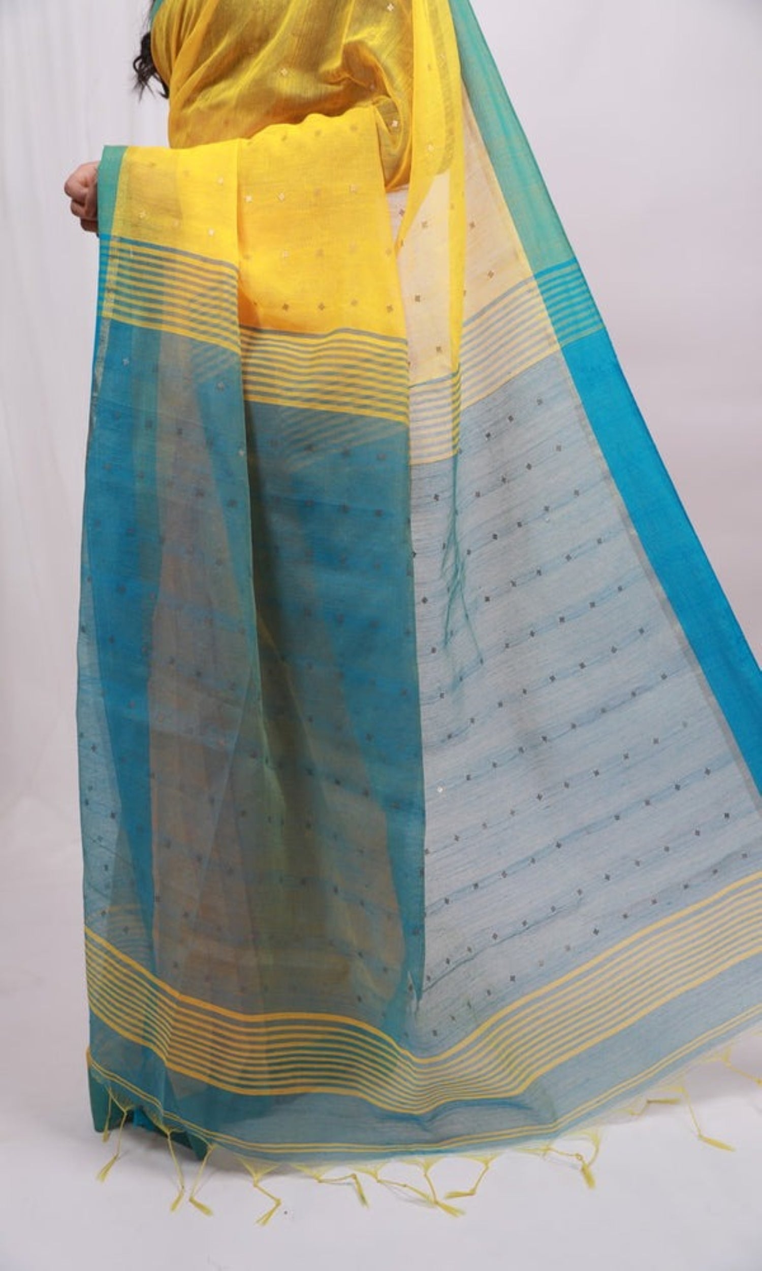 Piyari Fashion Handloom Cotton Blend Yellow Sequin SareeProduct Details:A fresh and vibrant addition to your wardrobes! This saree is crafted in Co...