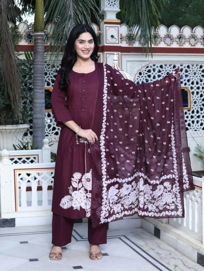 Miravan Women's Wine Pintucks Cotton Floral Elegant Straight Kurta and Palazzo with Dupatta Set