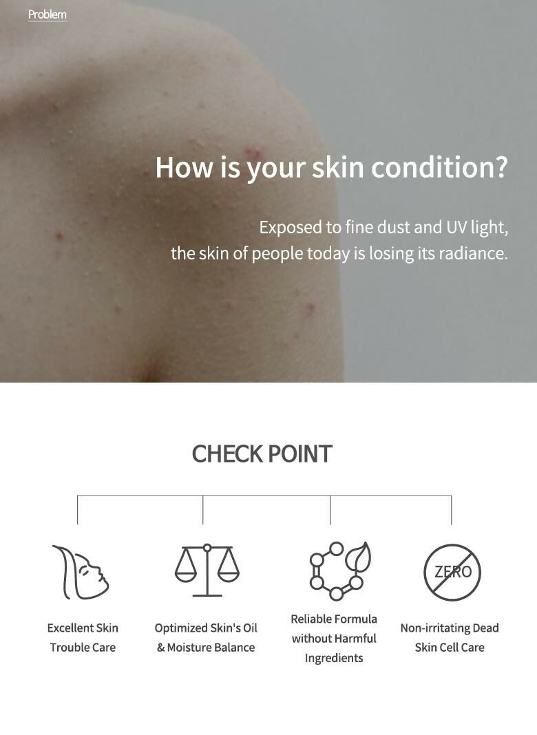 • Hypoallergenic test completed Sensitive skin can be used safely  Slightly acidic toner With a slightly acidic toner of pH5~pH7, it corrects the collapsed pH balance and takes care of the skin in a healthy way.