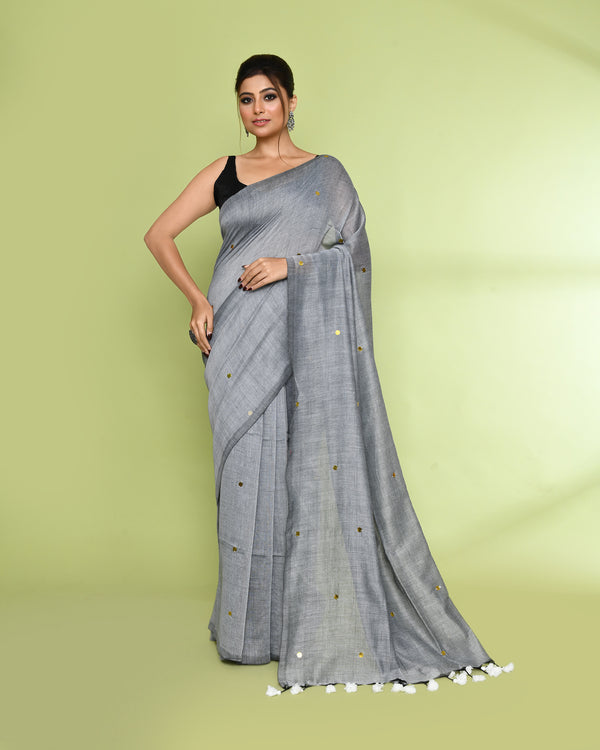 Piyari Fashion Women's Silver Grey Embellished Sequined Cotton Saree - Free Size