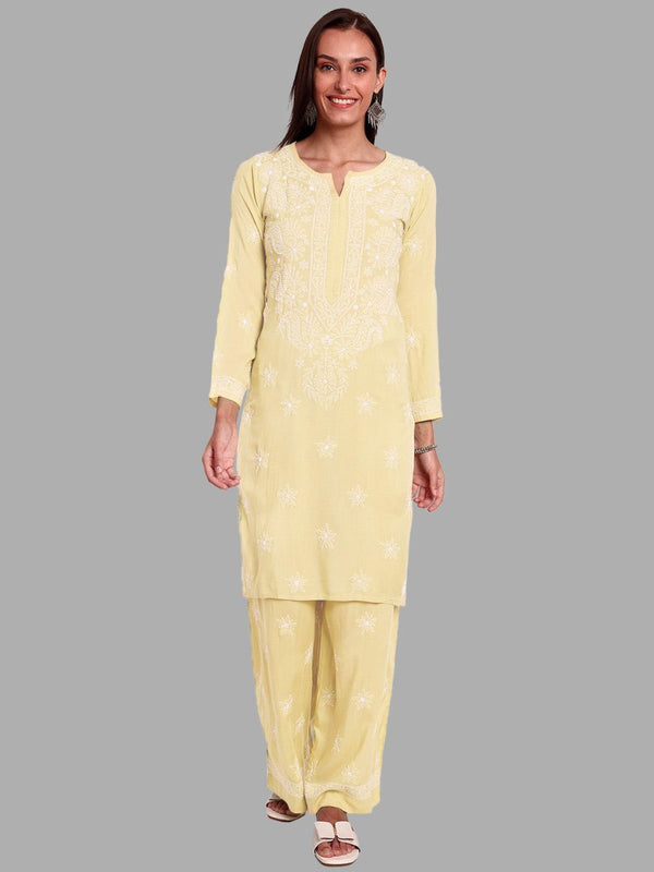 ADA Ethnic Motifs Embroidered Regular Chikankari Kurta with Palazzos Product Details Yellow embroidered Kurta with Palazzos Kurta design: E...