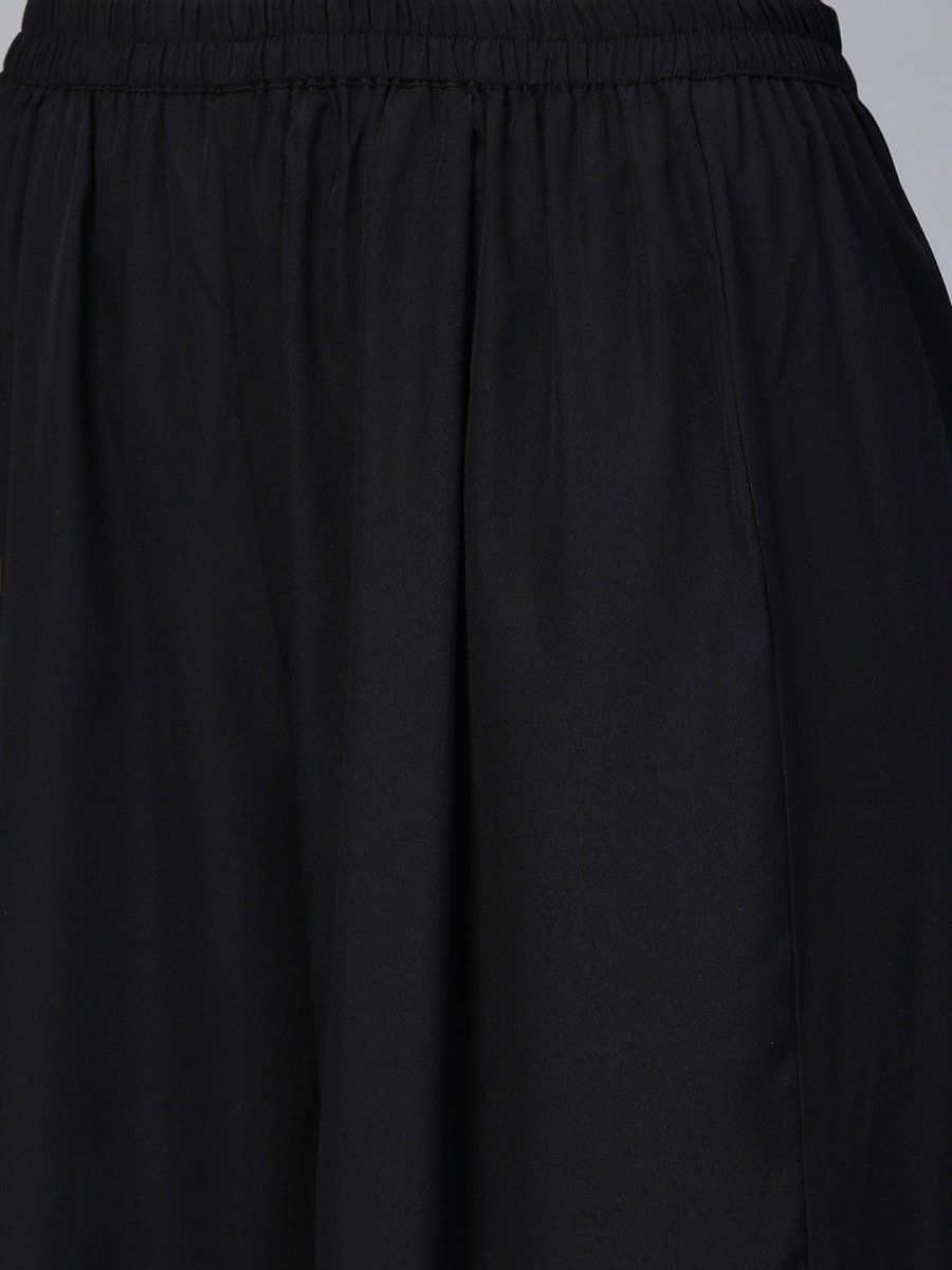 • Black solid palazzos, has an elasticated waistband, slip-on closure