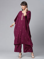 This comfortable burgundy kurta set from Ahalyaa is versatile to wear to a special event or wear with jeans for a casual look. Define your figure in this kurta set with a skinny belt for a modern take on this traditional garment.