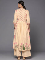 Ahalyaa Women Cream-Coloured & Pink Floral Print Pure Cotton Anarkali Kurta with Palazzos - S