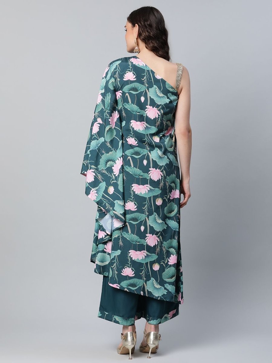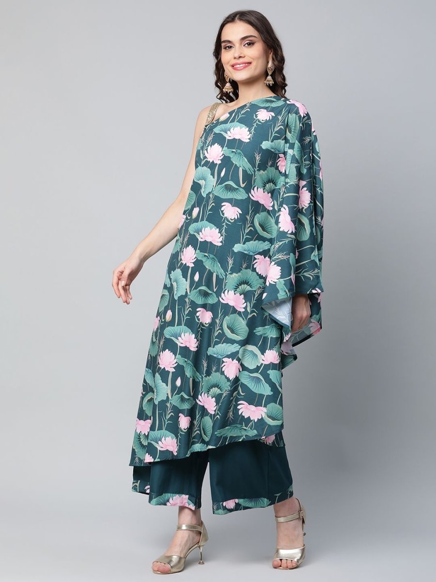 "This is Green Floral printed Kurta Palazzo Set, made from crepe fabric, A-line shape, Regular style, One shoulder, Calf length with asymmetric hem