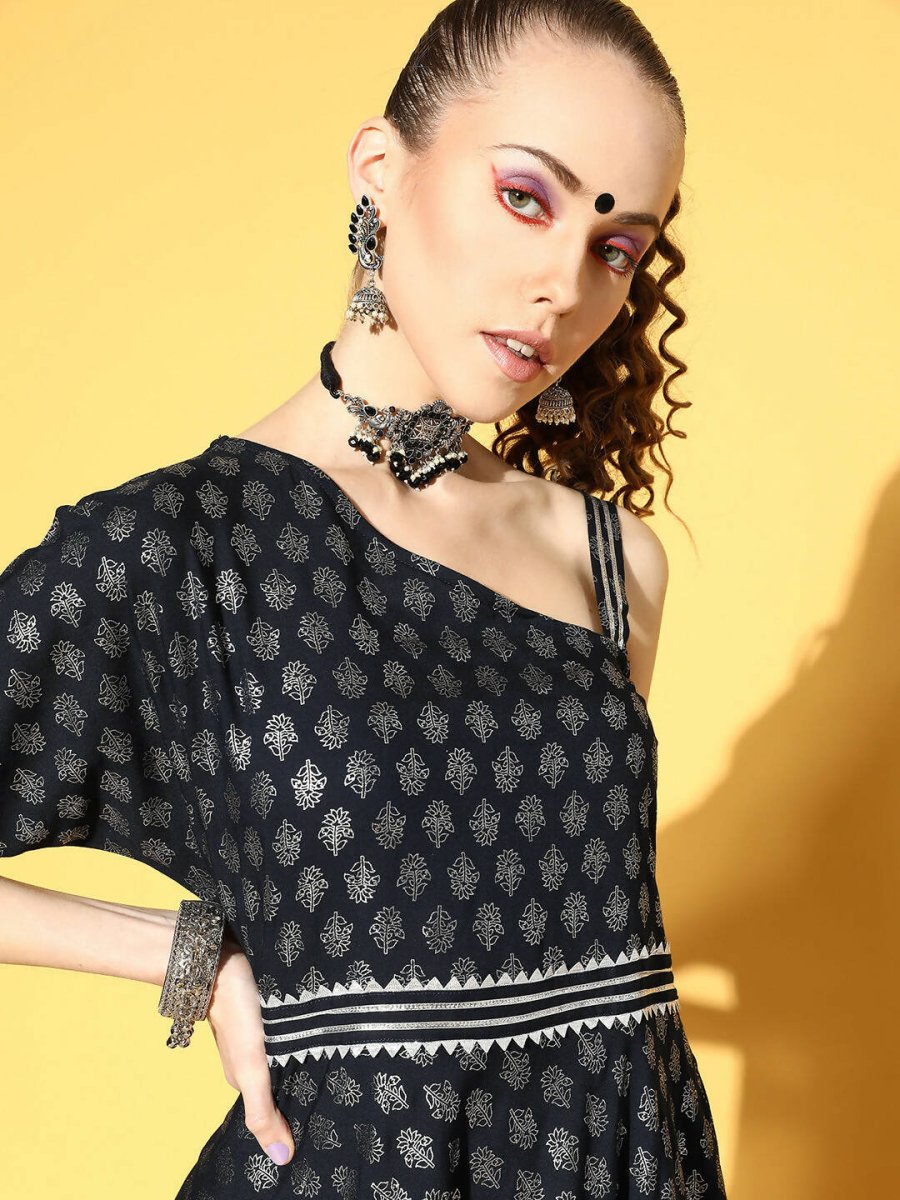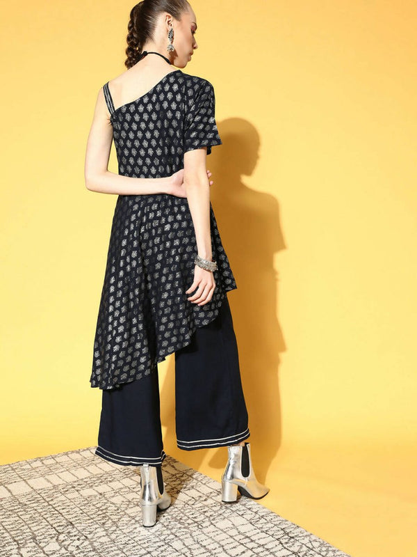 Every woman has to add this navy blue kurta set to her wardrobe, this stunning top palazzo set is from Ahalyaa. The detailing of this kurta is silver foil print. it features One Shoulder, Short sleeve, Curved hemline, Side Pocket & hip length. This rayon kurta is also worn in the summer season for a comfort zone. You can team it up with high heels or flat jutties with long earrings.