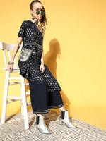 Ahalyaa Women Navy Blue Colour Rayon Silver Foil Printed Top Palazzo SetEvery woman has to add this navy blue kurta set to her wardrobe, this stunn...