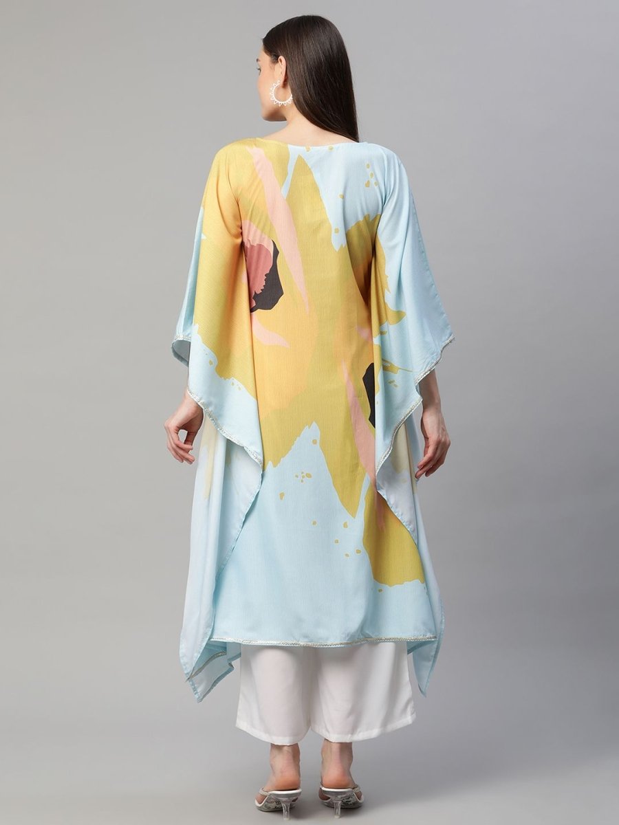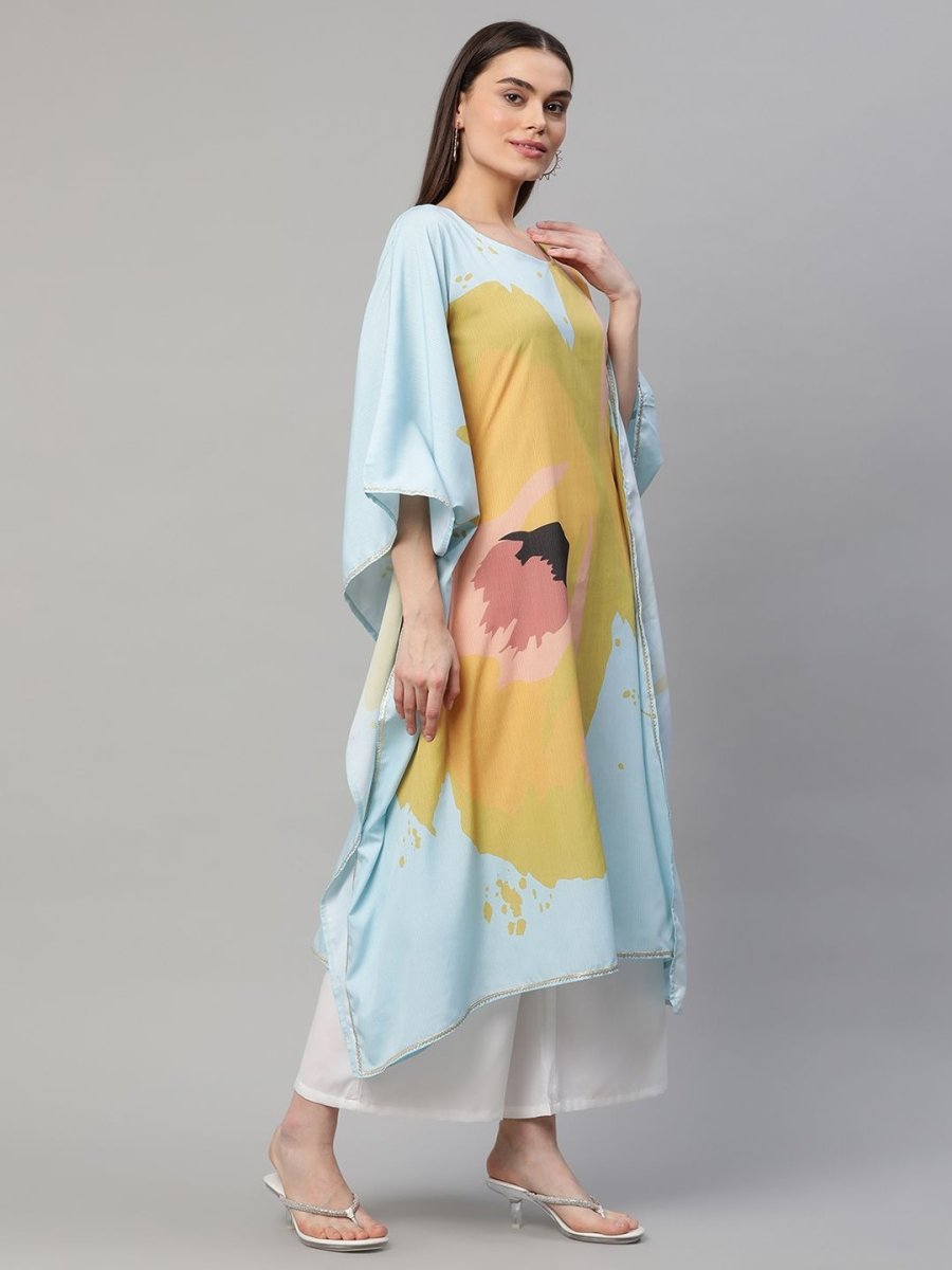 Ahalyaa Women Yellow Crepe Digital Printed Kaftan Kurta with Palazzos - S
