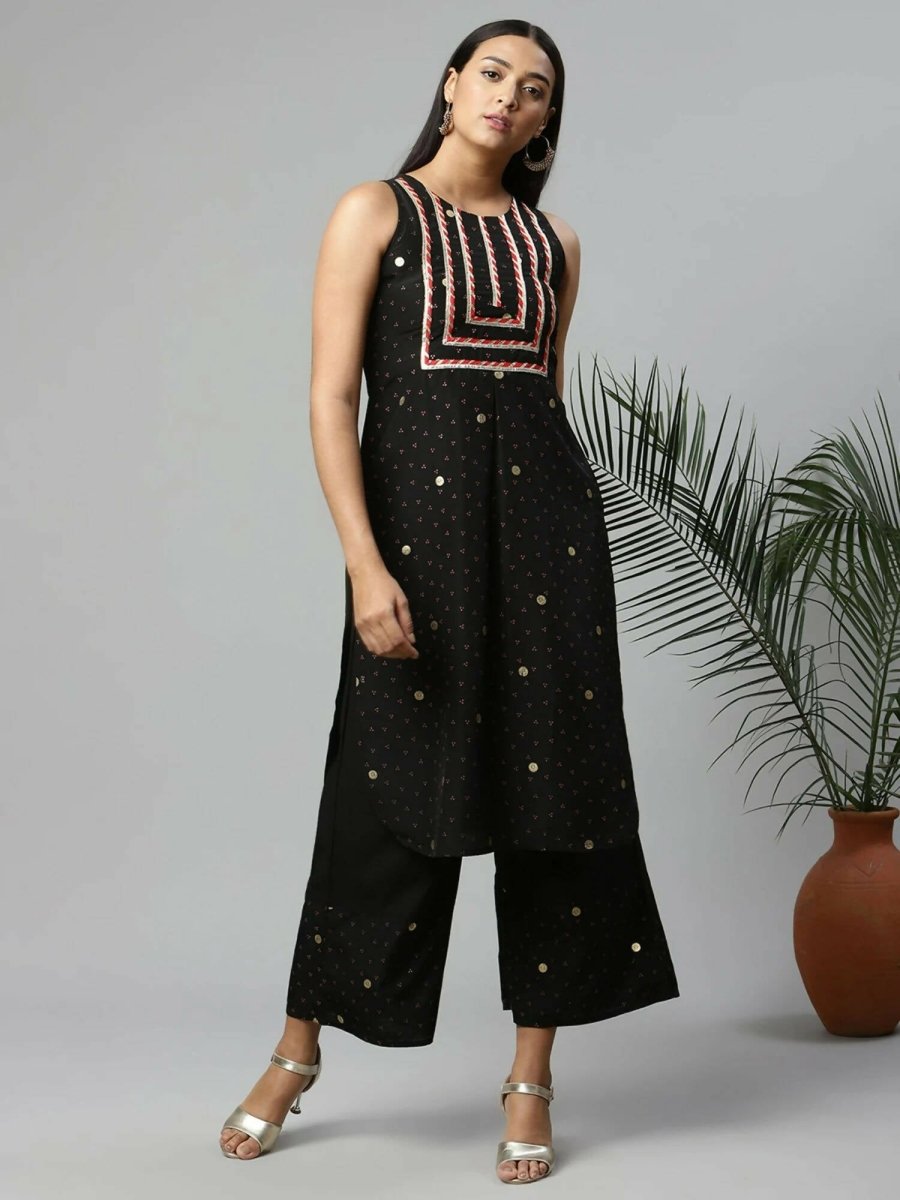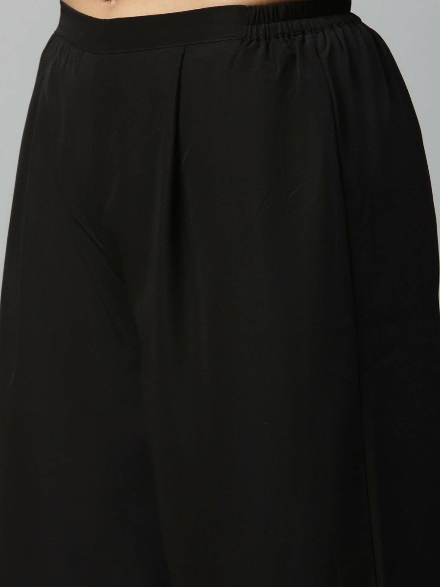 Ahalyaa Womens Black Crepe Printed Kurta Palazzo SetCelebrate your personal style and roots with this elegant black Color kurta set from Ahalyaa. K...