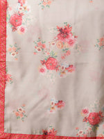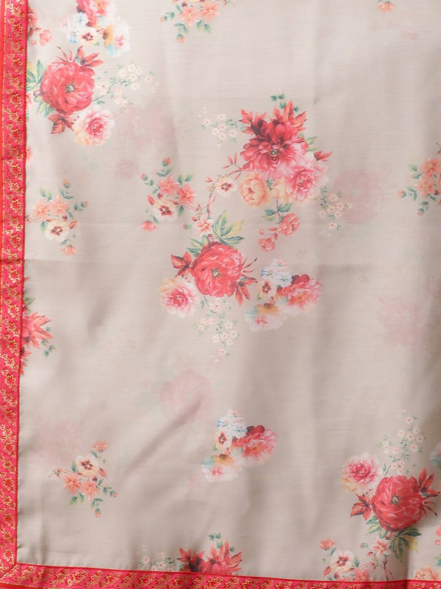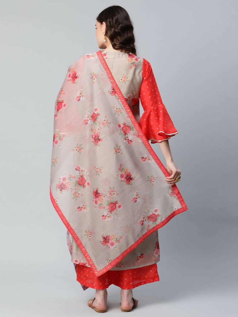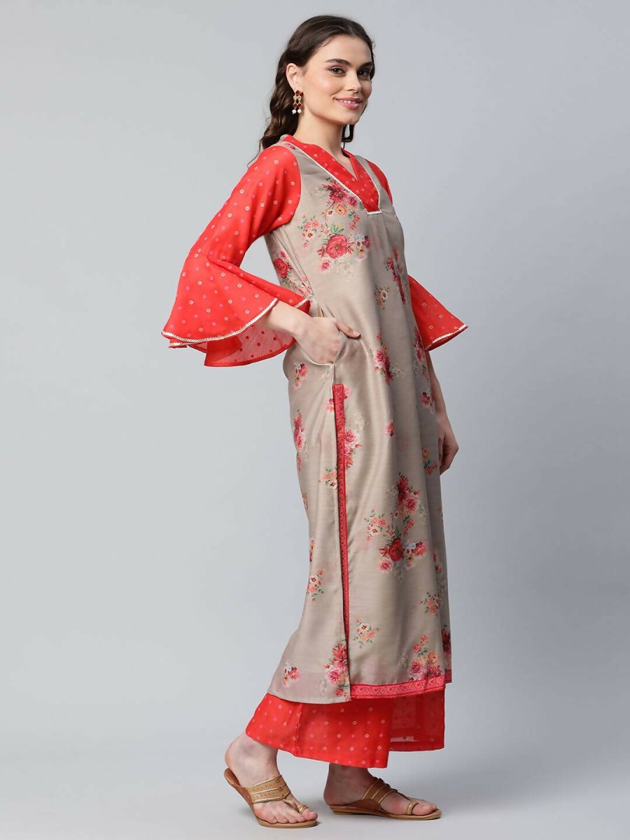 Add a touch of ethnicity to your wardrobe with this fashionable kurta palazzo set. Kurta is made from chanderi fabric. It comes with a lovely V-neck and a comfortable 3/4th Sleeve, Beige tone, Calf Length (44"), Curved hemline, and Side pocket. the detailing of this kurta is a floral digital print. printed palazzo, Partially elasticated waist, Chanderi fabric, Machine wash. You can team it up with high heels or flat jutties with long earrings.