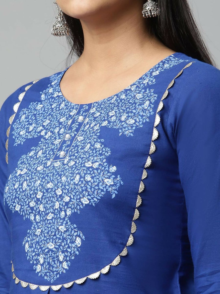 Ahalyaa Womens Royal Blue Pure Cotton Printed Tunic Palazzo SetFlaunt your glam look when you step out donning this voguish pure cotton Kurta palaz...