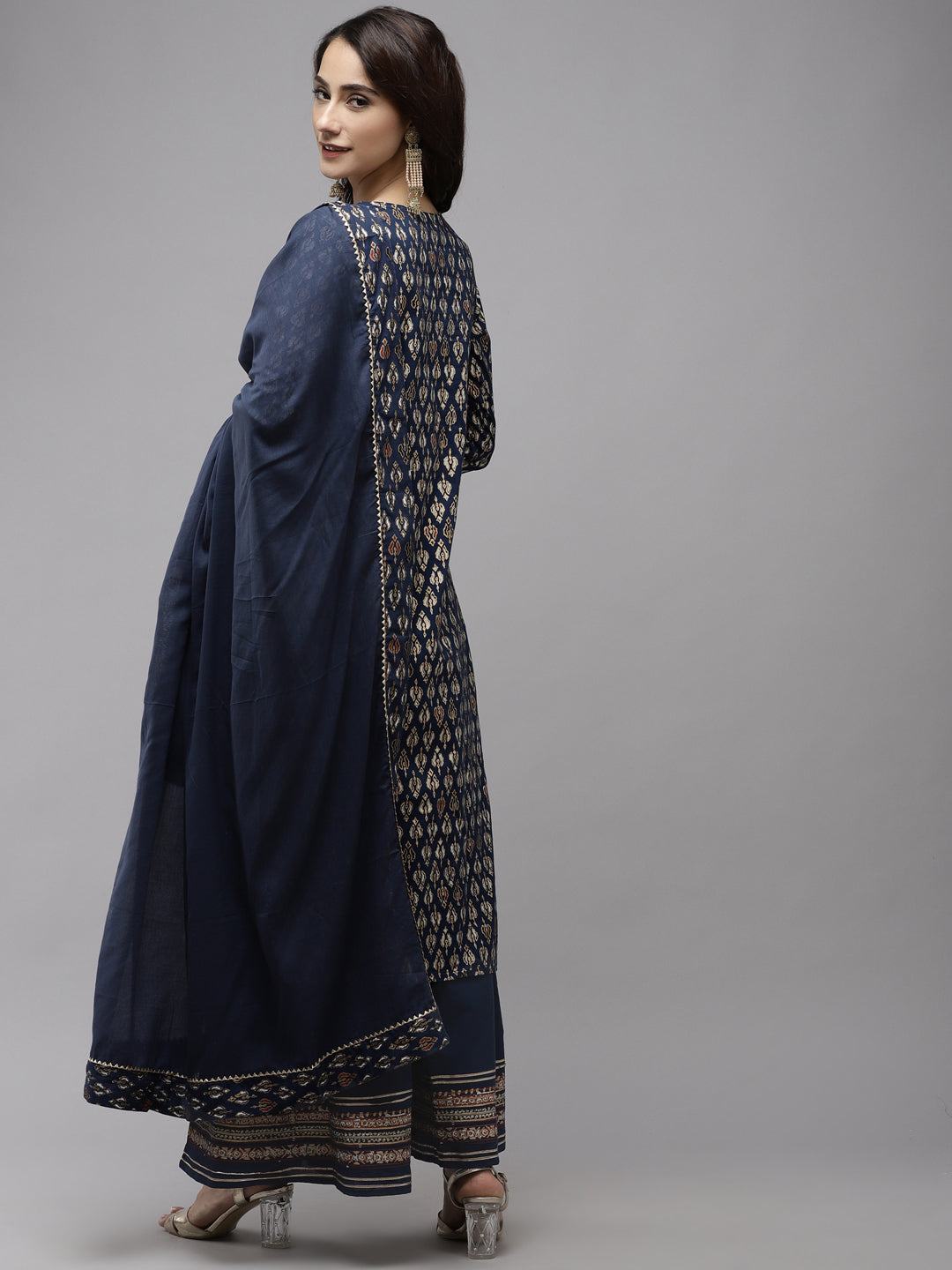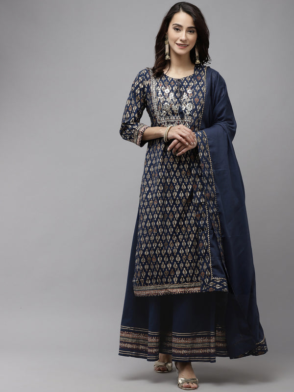 Ishin Women Navy Blue Floral Embroidered Regular Gotta Patti Pure Cotton Kurta with Palazzos & With Dupatta