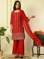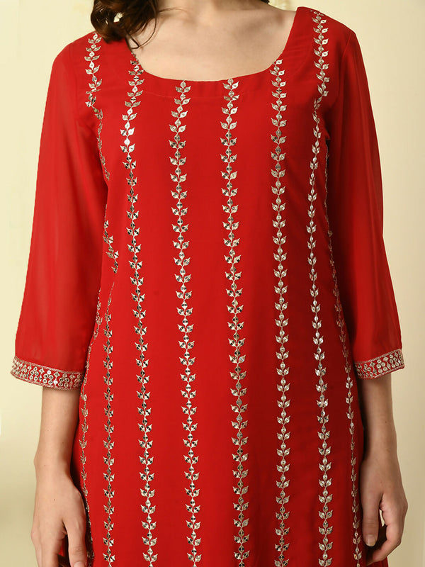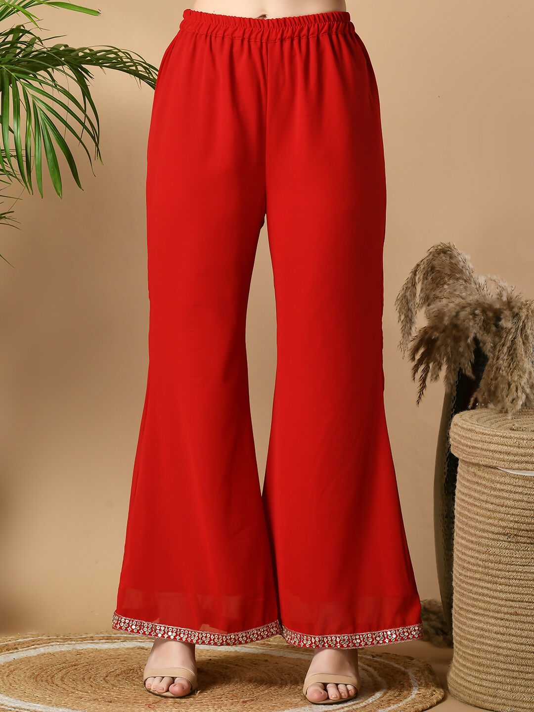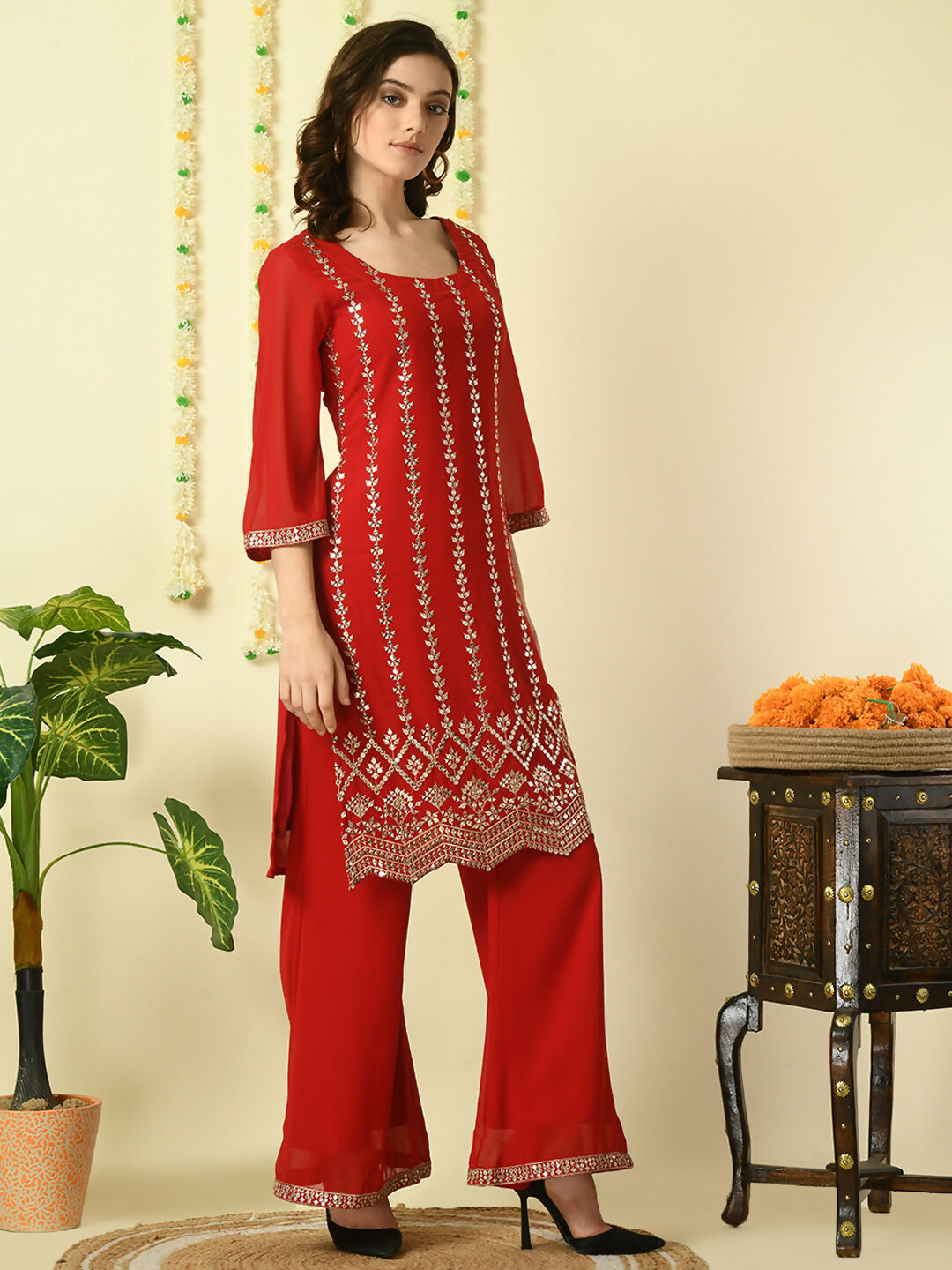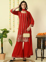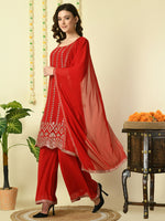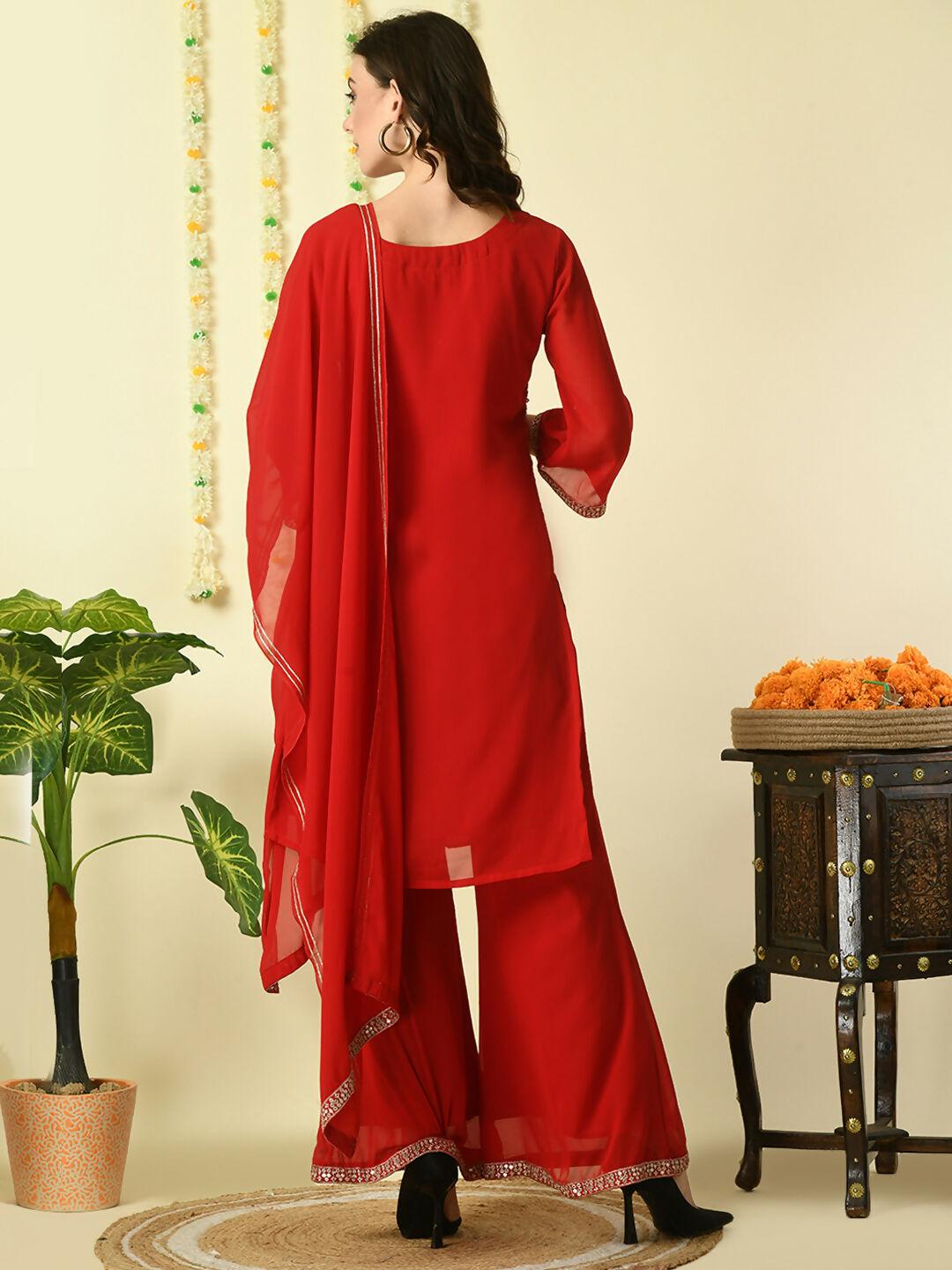 Myshka Women's Red Georgette Kurta & Palazzos With Dupatta Party Sets