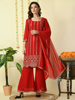 Myshka Women's Red Georgette Kurta & Palazzos With Dupatta Party Sets - S
