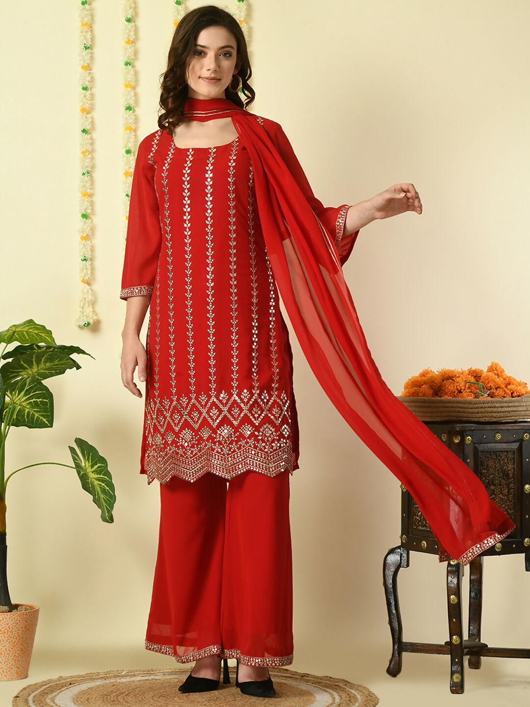 Myshka Women's Red Georgette Kurta & Palazzos With Dupatta Party Sets Color: Red Top Type: Kurta Bottom Type: Palazzos Dupatta: yes Dupat...