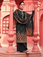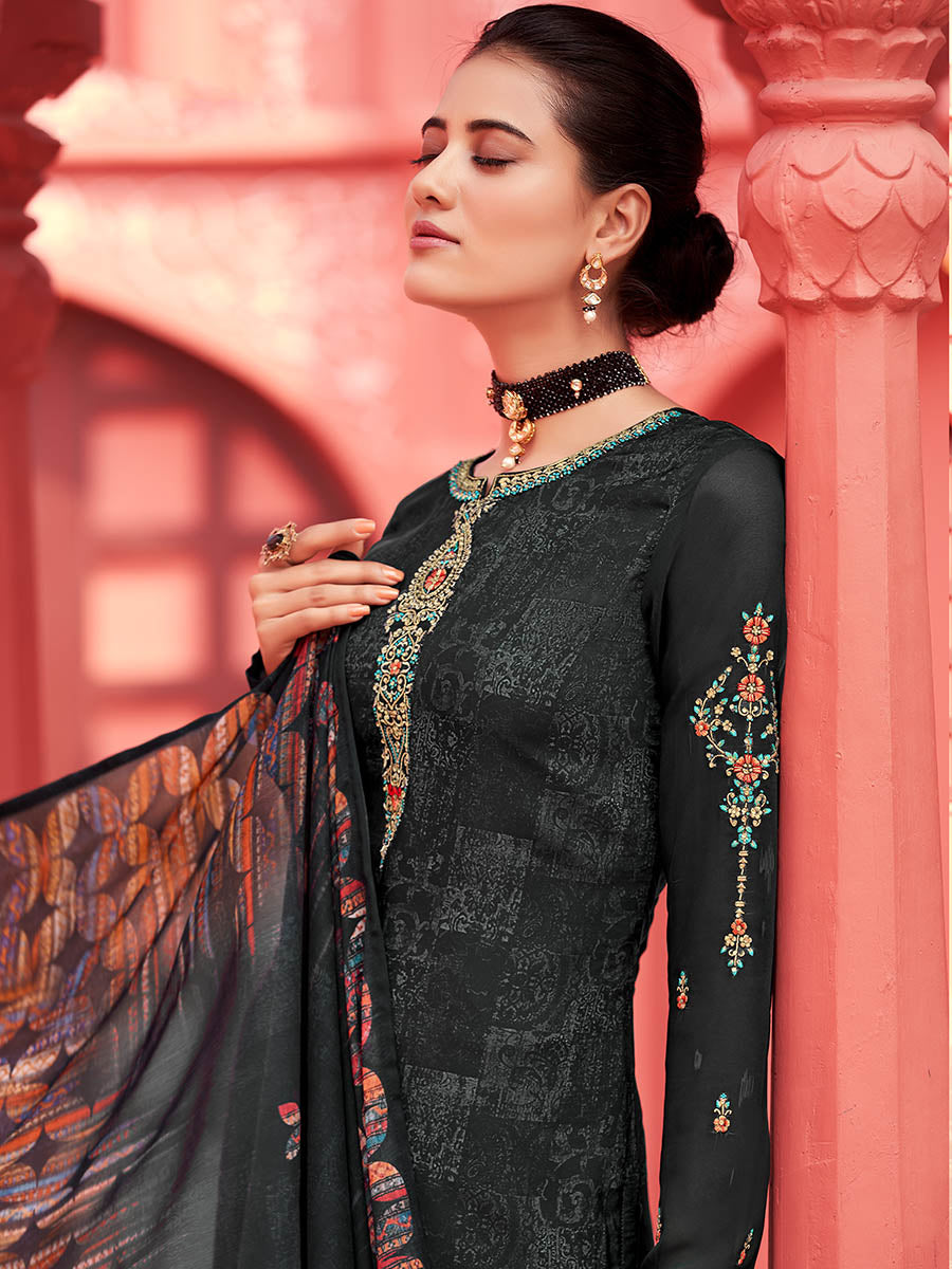 Black Digital Print French Crepe palazzo Suit features a digital printed french crepe with neckline with digital print chiffon dupatta with chiffon dupatta. This Style is made in India and checked by hand to ensure high quality.