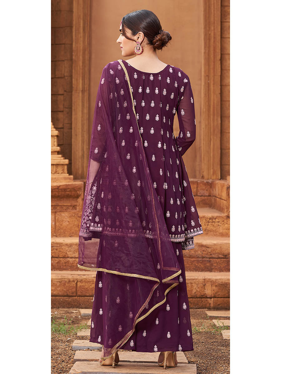 Purple heavy Georgette Koti Style Embroidered Sharara Suit features a heavy georgette with heavy Embroidery with heavy santoon and heavy georgette bottom with embroidery with faux georgette dupatta with four line lace.