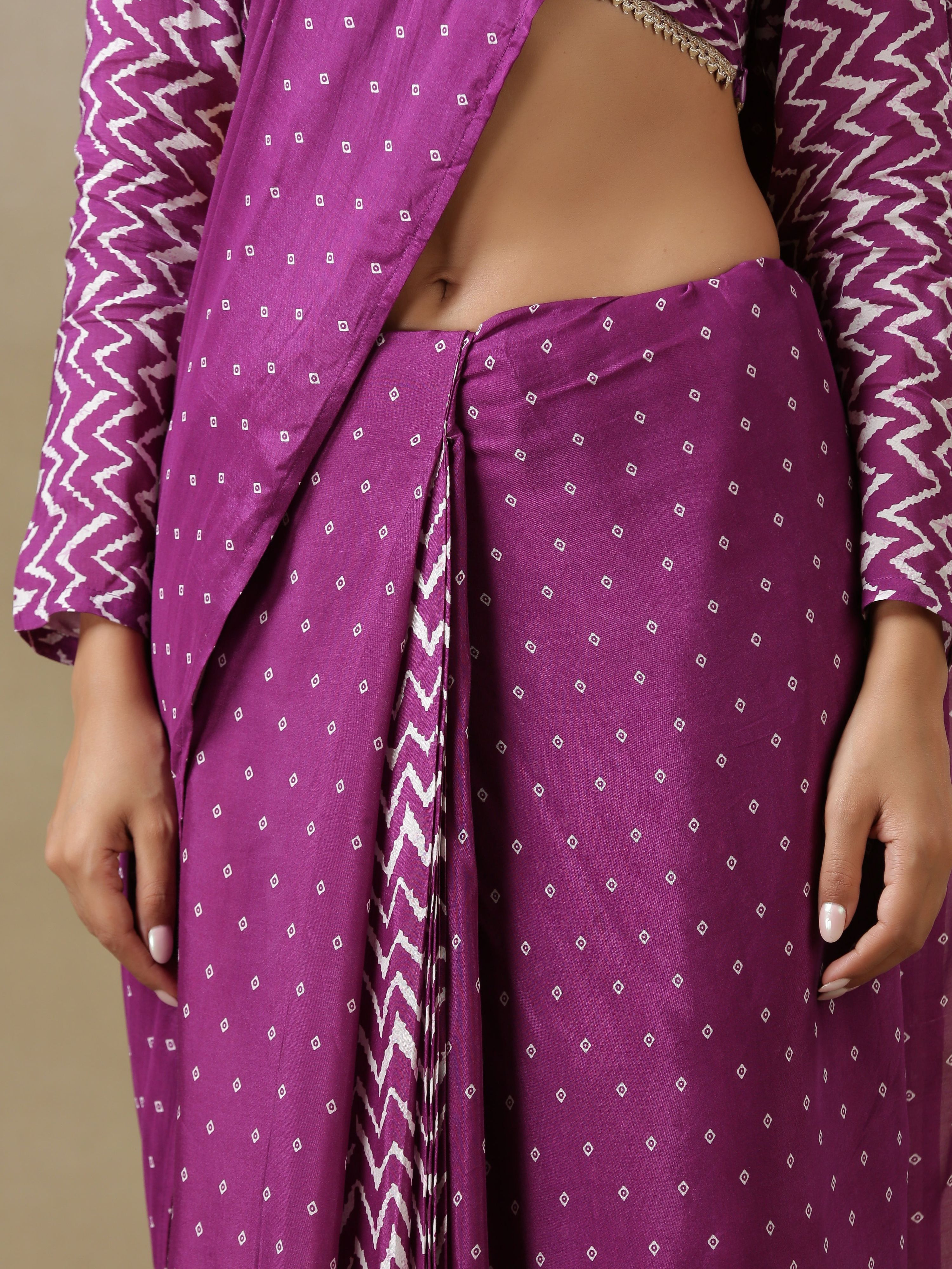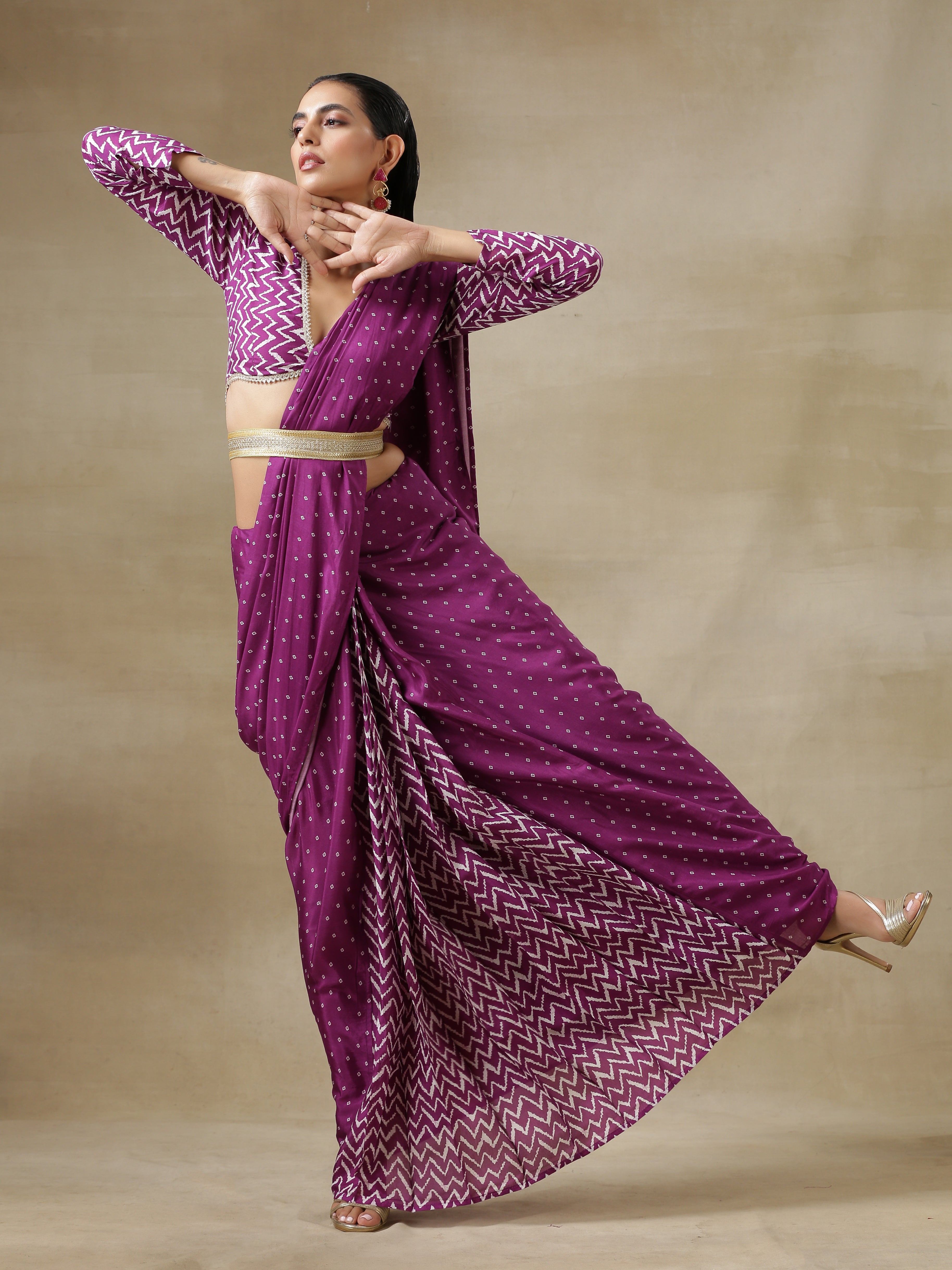 • Purple single dot bandhani printed ready saree with purple zig- zag printed pre-stitched pleats. It has lace belt to complete the look.