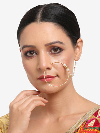 Gold-Plated White Kundan-Studded Nose Ring With Chain - Ruby Raang - Distacart