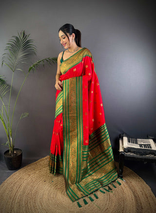 Sonakshi Women's Red Soft Silk Zari Woven Traditional Saree with Blouse