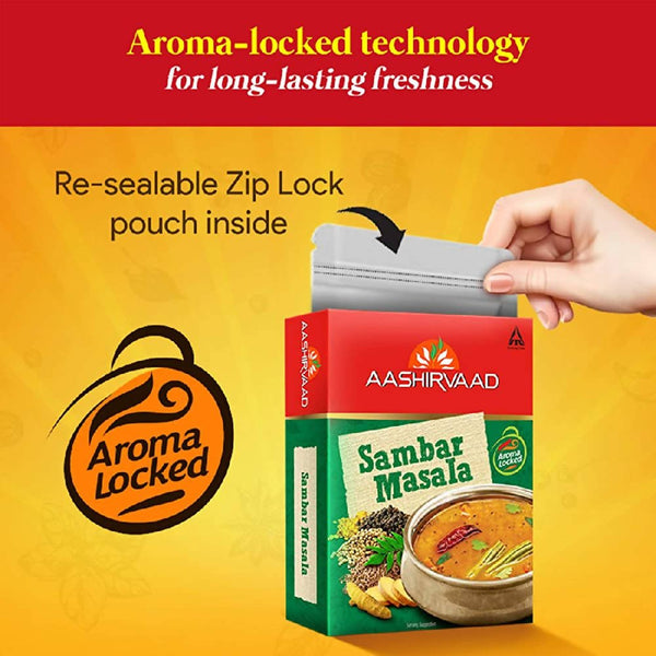 Aashirvaad Sambar MasalaKey Ingredients: coriander Red chilli Fenugreek Cumin Curry leaves Directions of use: Cook 1/2 teacup Toor Dal (50 g) In a ...