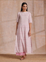 trueBrowns Pink Green Floral On White Block Print Cotton Slit Kurta Pant Set | ReloveDescription Cotton printed long slit kurta. It comes along wit...