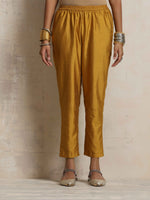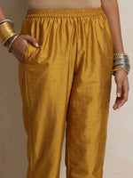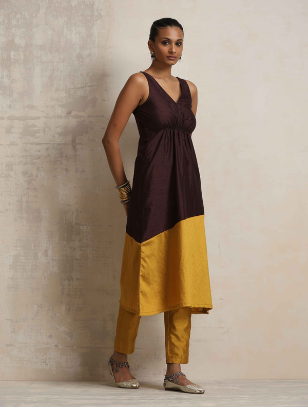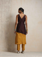 • Elevate your style with this cola silk blend panelled kurta paired perfectly with gold silk blend elasticated waist pants.